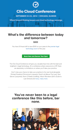 Since 2013, Clio has been hosting a truly innovative and exciting conference on law firm management. The conference now boasts over 2000 attendees, but getting there took hard work. And marketing the 2014 conference (the second ever) meant getting 300 early adopters to Chicago for two jam-packed days of learning.