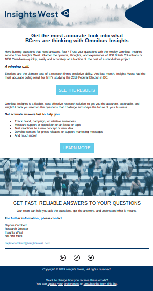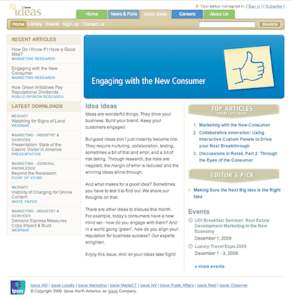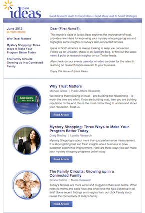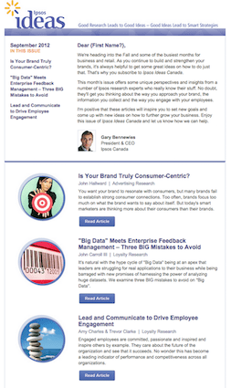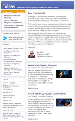 Every month for seven years, one for thousands of US contacts and one for thousands of Canadian contacts, I produced, curated, edited, measured, and optimized the Ipsos Ideas email newsletter, the company’s premiere email campaign and client engagement piece.